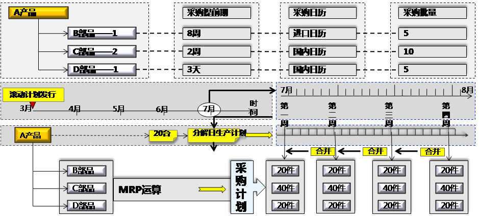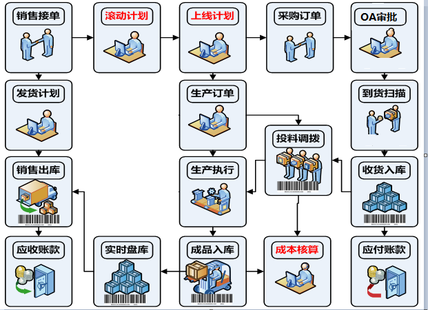 1. 銷售接單后,計(jì)劃部門編排1個(gè)月的滾動(dòng)計(jì)劃,MPS運(yùn)算出生產(chǎn)計(jì)劃、MRP運(yùn)算出采購計(jì)劃。